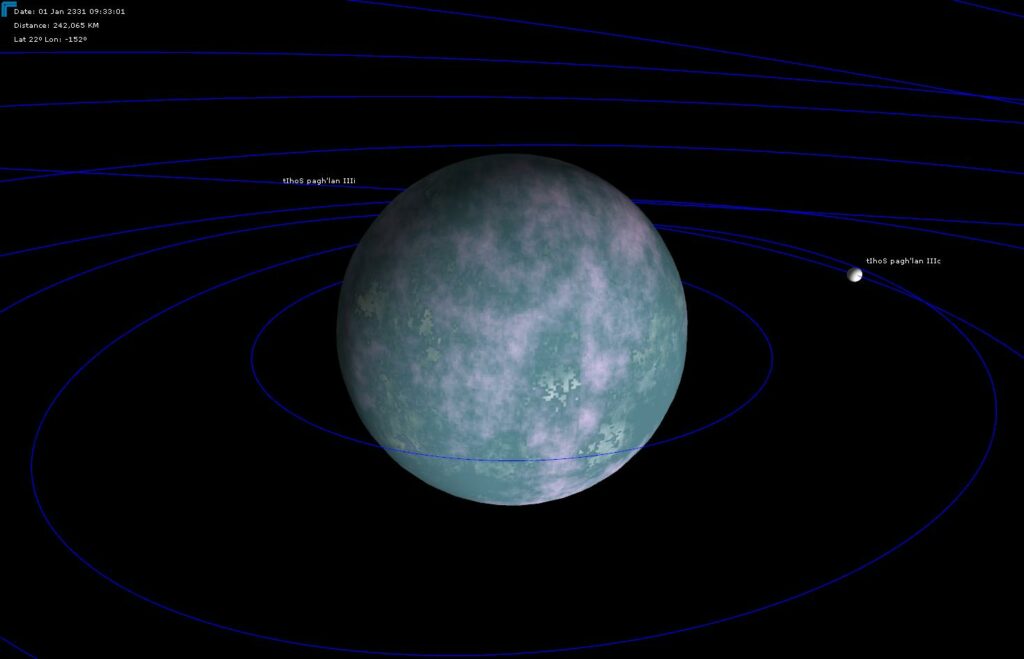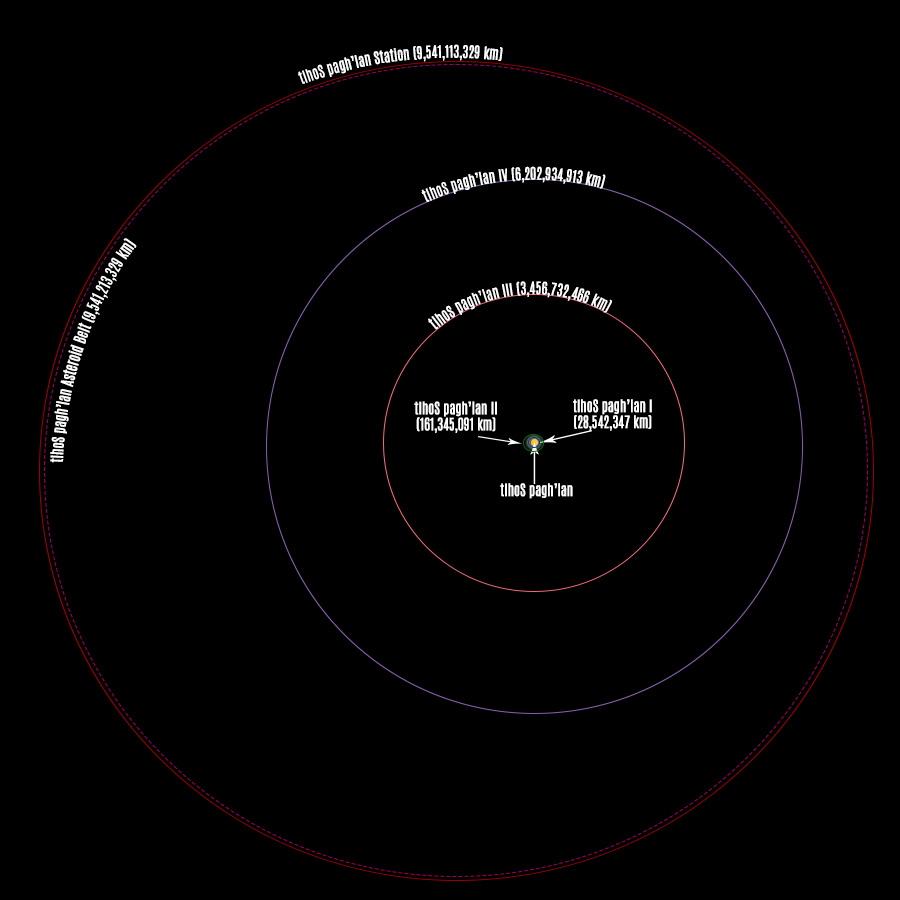 tIhoS pagh’lan II is a gas giant with a significant number of satellites. Its 10 moons are all uninhabitable rocks, but several are large enough and possess enough water for terraforming. However, their significant distance from their star renders this usage highly unlikely.